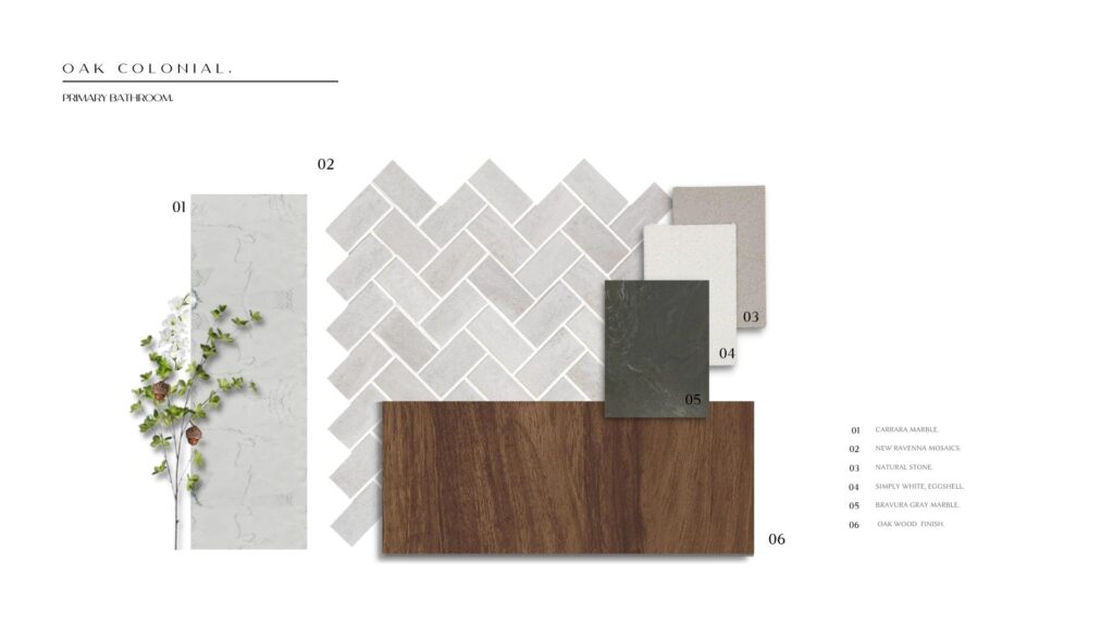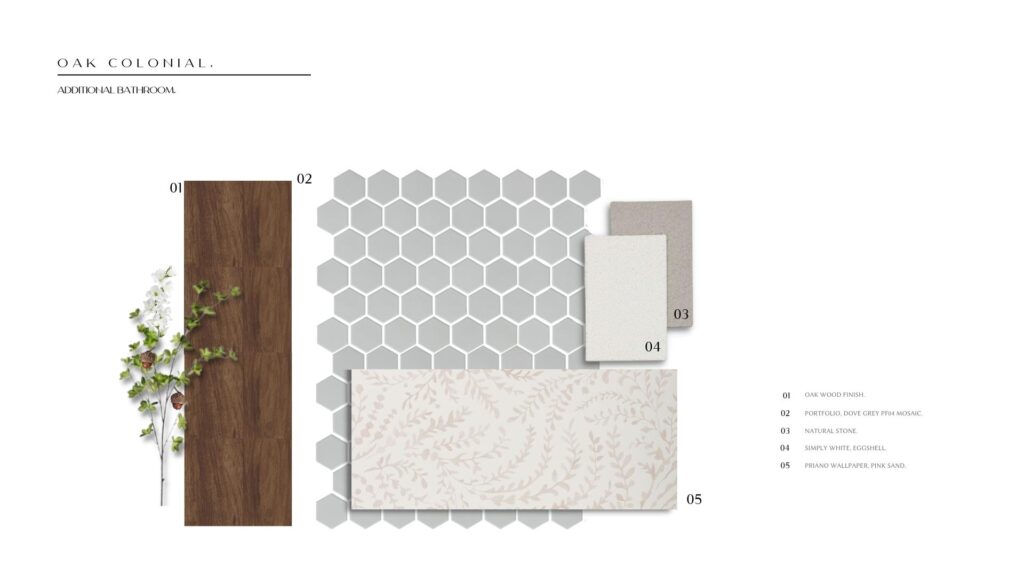 If you’re interested in replicating the look and feel of the Oak Colonial in your own home, here’s a little teaser of the materials: