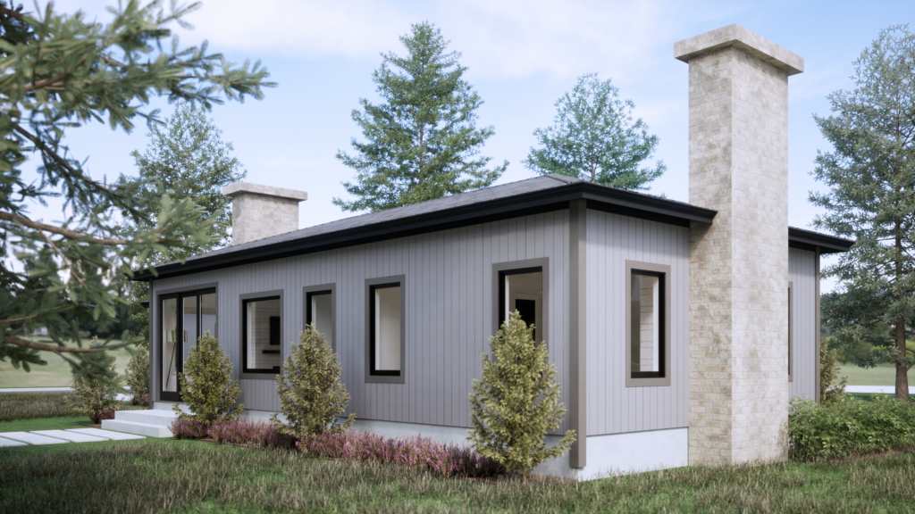 Crafted on a slab with no basement, this simple ranch house plan optimizes space and cost-efficiency, keeping HVAC essentials tucked away within a utility closet. Its sleek low-pitch hip roofline, paired with chic dark siding and windows, exudes a contemporary allure with clean lines.