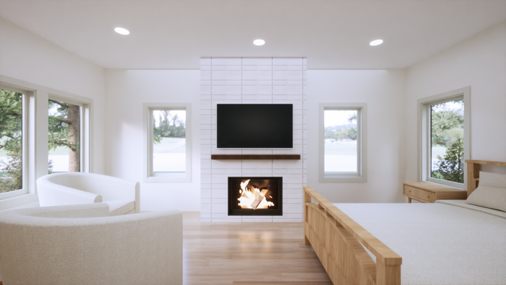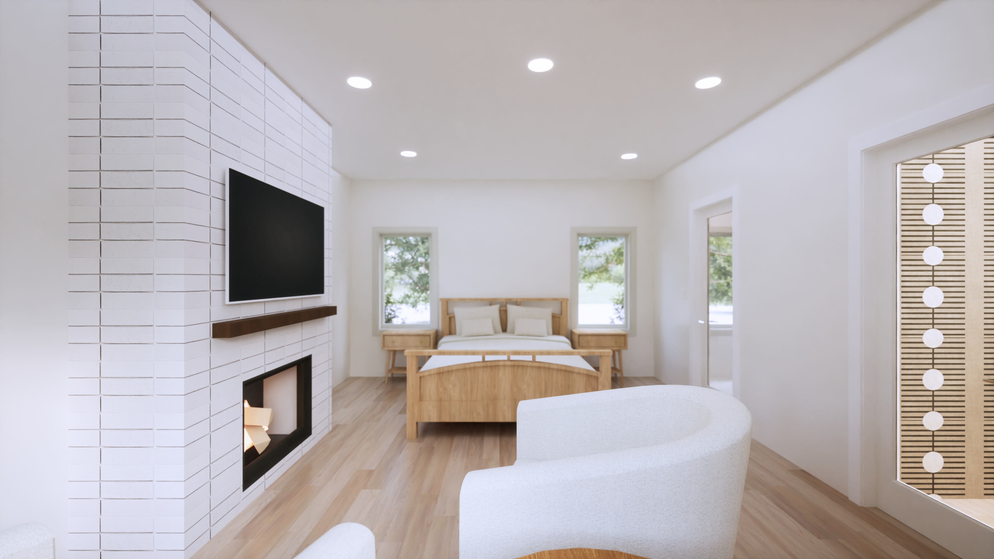 The primary suite is tucked away on its own, featuring a private fireplace, three walls of windows, a full bath, and walk-in closet.