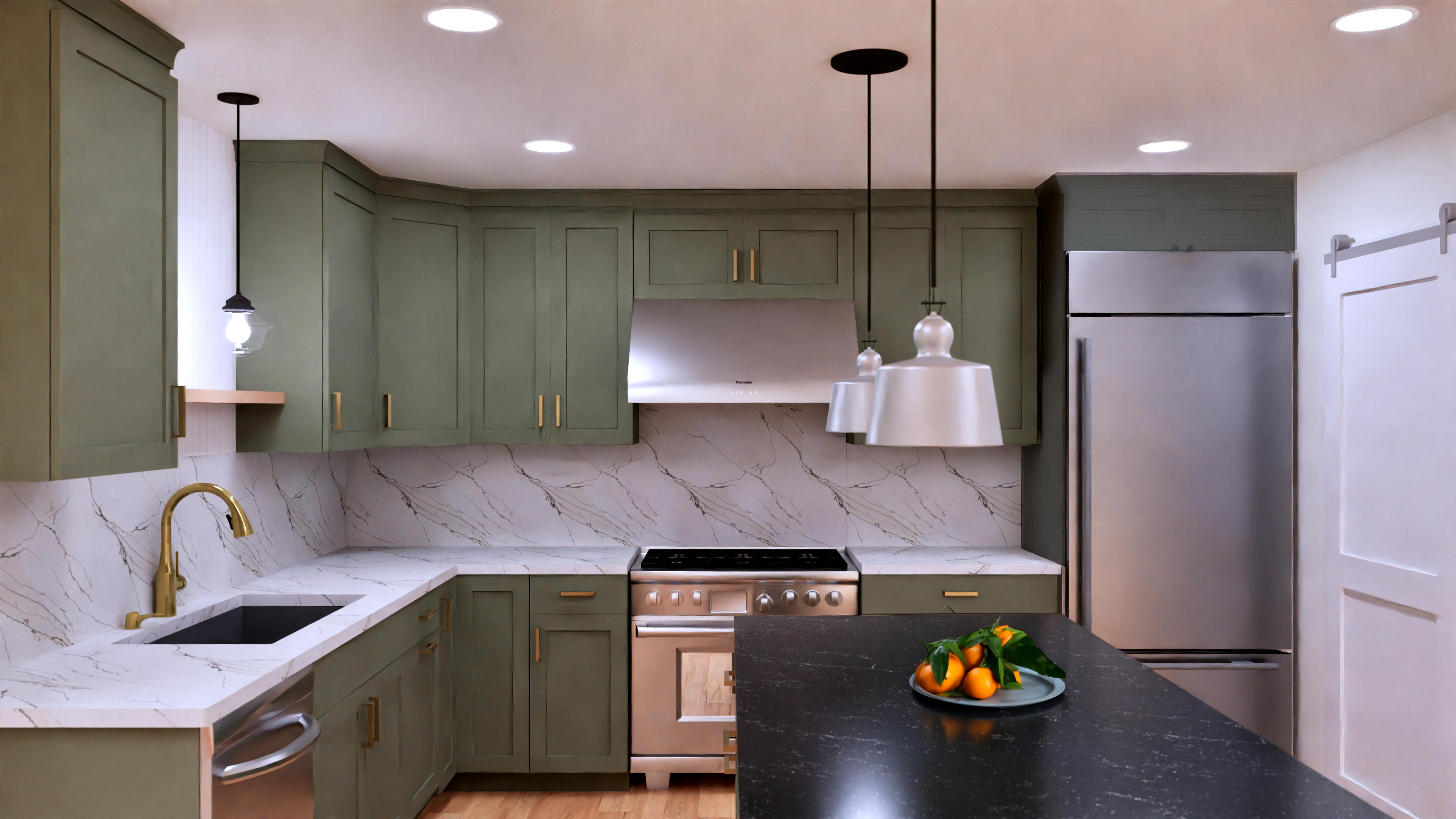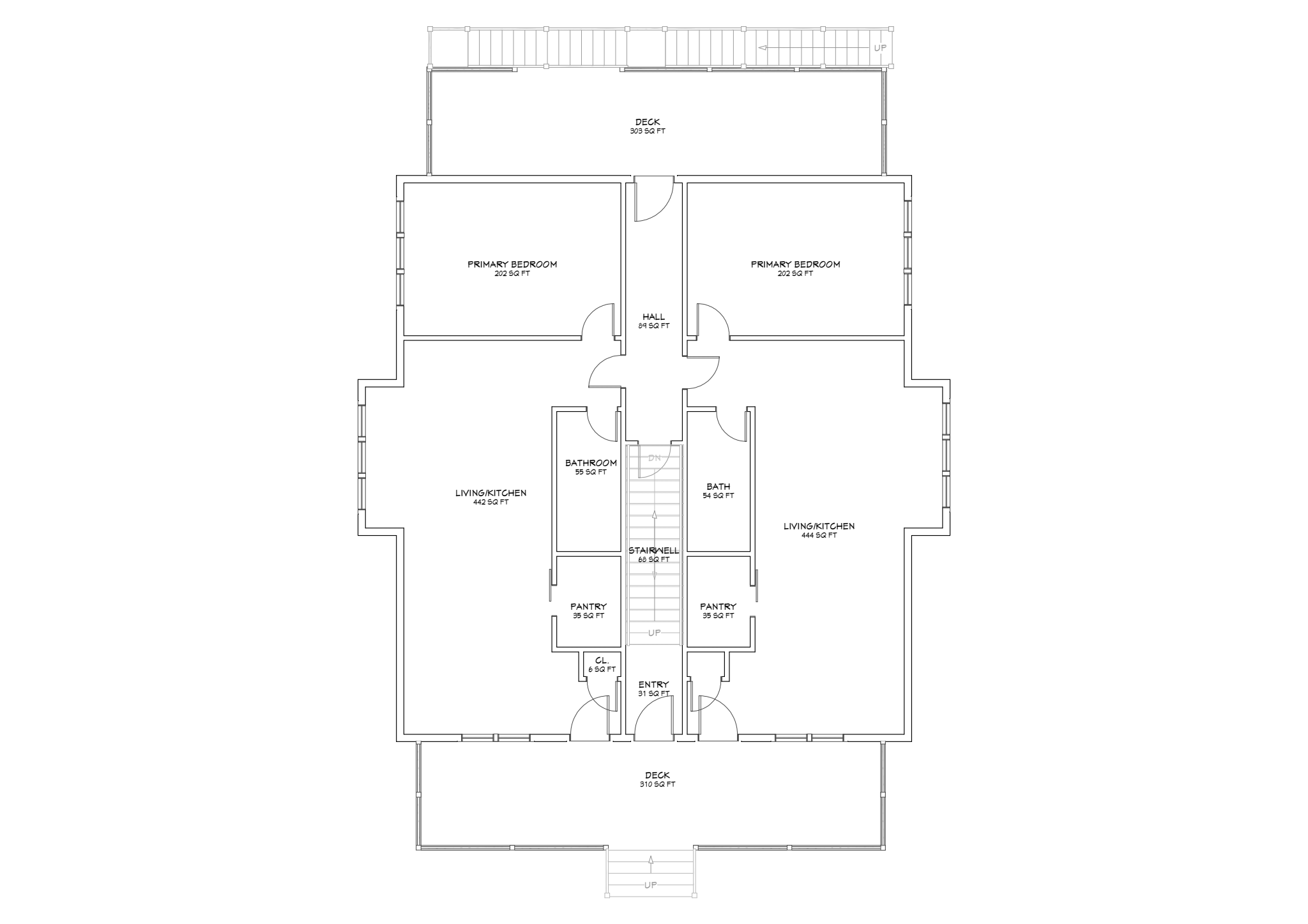 The Chestnut gambrel-style apartment building is complete with four apartments. The two first-floor apartments have access to the front deck and a back deck. Each of those first-floor apartments has one bedroom, kitchen, pantry, full bath, and living area. On the second floor, there is a two-bedroom apartment with a primary suite, guest bedroom suite, living area, dining and full kitchen with pantry. This apartment has a private back deck. The 3rd-floor apartment has two bedrooms with a jack-and-jill bathroom and open concept living room, dining and kitchen area with access to the back deck.