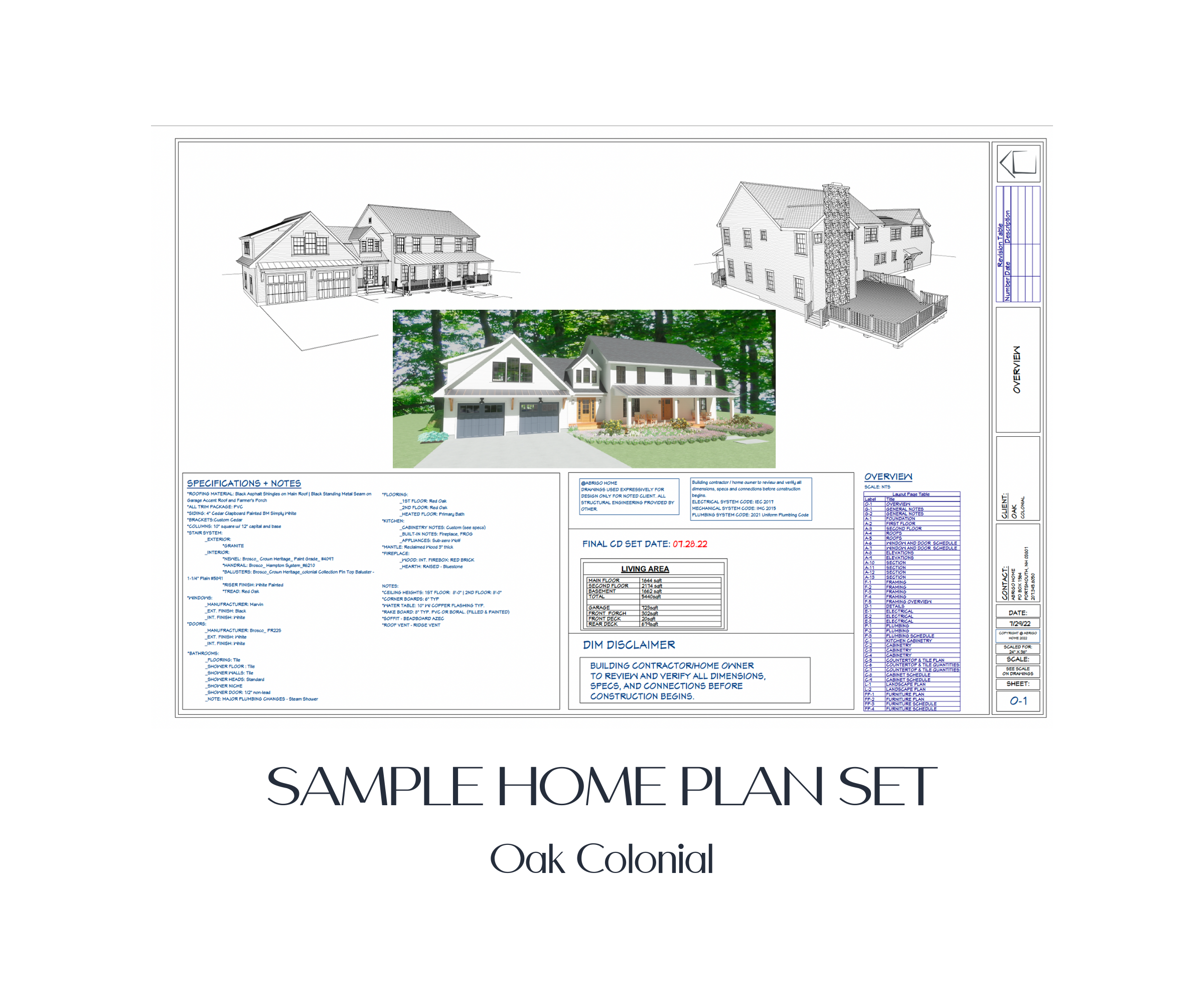 Designed in the classic colonial style, the Oak Colonial features four bedrooms, two and a half bathrooms, and two home offices. There is 5440 square feet of living space, with an additional 723 square foot garage and 1001 square foot deck to the front and back of the house.